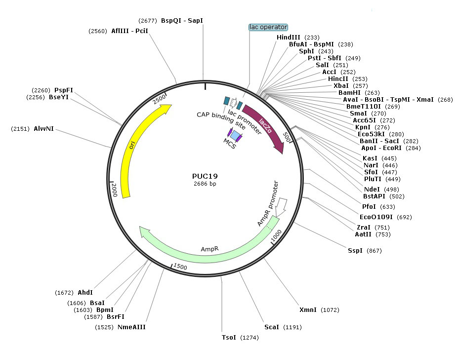 pUC18 和 pUC19 大小只有 2686bp ,是最常用的質(zhì)粒載體,其結(jié)構(gòu)組成緊湊,幾乎不含多余的 DNA片段,GenBank注冊(cè)號(hào)為 L08752(pUC18)和 X02514(pUC19)。由 pBR322 改造而來,其中 lacZ (MSC)來自 M13mp18/19 。這兩個(gè)質(zhì)粒的結(jié)構(gòu)幾乎是完全一樣的,只是多克隆位點(diǎn)的排列方向相反。這些質(zhì)粒缺乏控制拷貝數(shù)的 rop 基因,因此其拷貝數(shù)達(dá) 500-700 。 pUC 系列載體含有一段 lacZ 蛋白氨基末端的部分編碼序列,在特定的受體細(xì)胞中可表現(xiàn) α-互補(bǔ)作用。因此在多克隆位點(diǎn)中插入了外源片段后,可通過 α-互補(bǔ)作用形成的藍(lán)色和白色菌落篩選重組 質(zhì)粒。pUC18、pUC19載體適合于DNA片段的克隆、進(jìn)行DNA測(cè)序、對(duì)外源基因進(jìn)行表達(dá)等。由于在lacZ領(lǐng)域中含有多克隆位點(diǎn),因此在以lacZ缺欠細(xì)胞作為宿主 (如:JM109等) 進(jìn)行轉(zhuǎn)化后,在含有IPTG、X-Gal 的平板培養(yǎng)基上進(jìn)行培養(yǎng)時(shí),可以很容易地通過藍(lán)白篩選,判斷載體中有無DNA片段的插入。同時(shí)還可以通過載體上的lac promoter表達(dá)外源基因,對(duì)插入載體中的DNA片段進(jìn)行測(cè)序等。進(jìn)行DNA測(cè)序時(shí),可以方便地使用M13系列的通用引物。