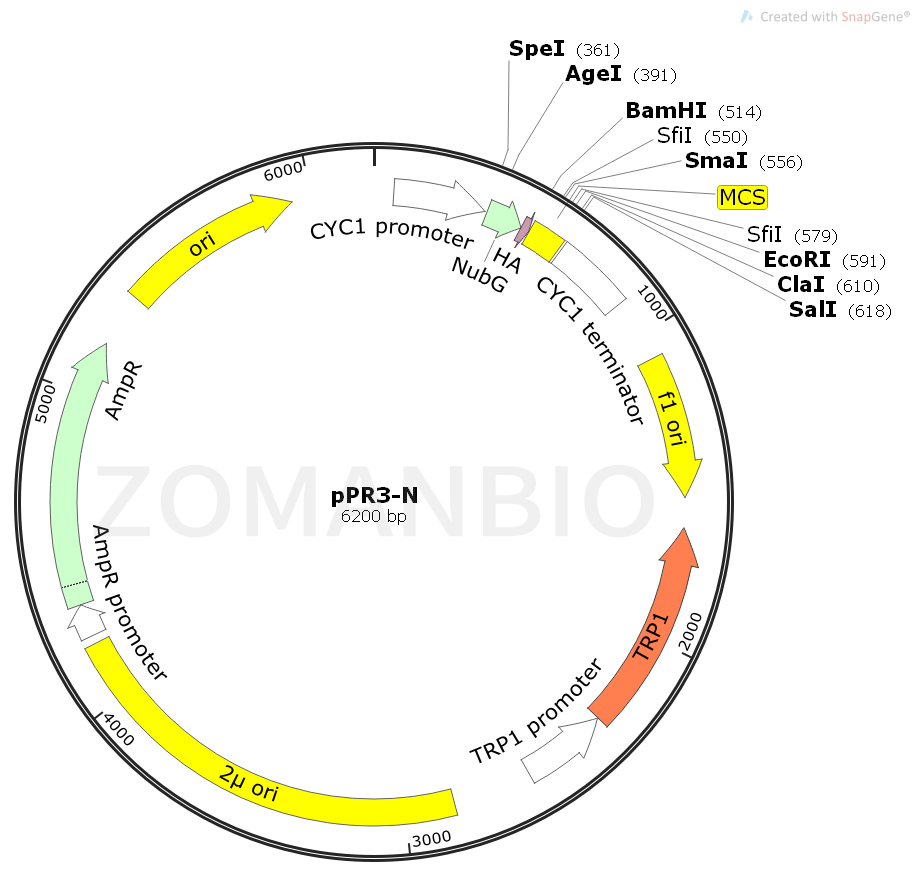 pPR3-N是一個(gè)用于膜蛋白酵母雙雜交實(shí)驗(yàn)的質(zhì)粒。The DUALmembrane system is intended for the detection and identification of interactions involving integral membrane proteins and membrane-associated proteins in yeast. The DUALmembrane pairwise interaction kit enables you to: