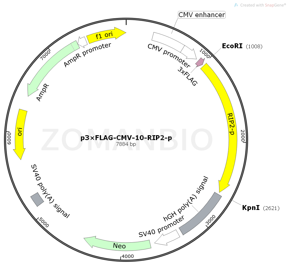 p3×FLAG-CMV-10-RIP2-p質(zhì)粒是一個豬源基因過表達(dá)質(zhì)粒,CMV啟動子驅(qū)動3×FLAG標(biāo)簽和RIP2基因融合表達(dá)。