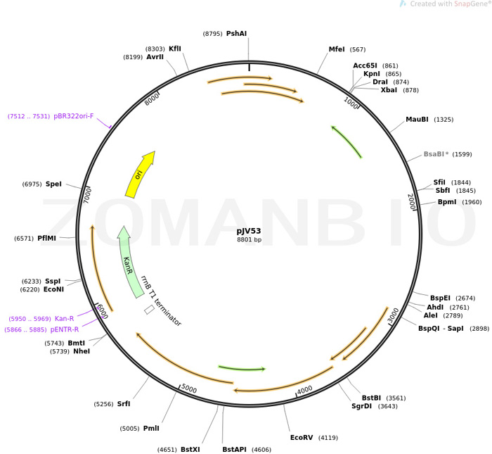 pJV53質(zhì)粒提供分枝桿菌噬菌體的Che9c genes 60-61基因,本質(zhì)粒的參考文獻(xiàn):Recombineering in Mycobacterium tuberculosis.