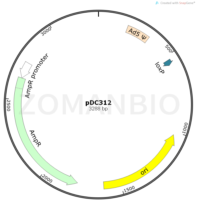 pDC312質(zhì)粒是一個(gè)腺病毒表達(dá)載體,MCS處前后無CMV啟動(dòng)子和poly A終止子,方便插入完整表達(dá)盒。