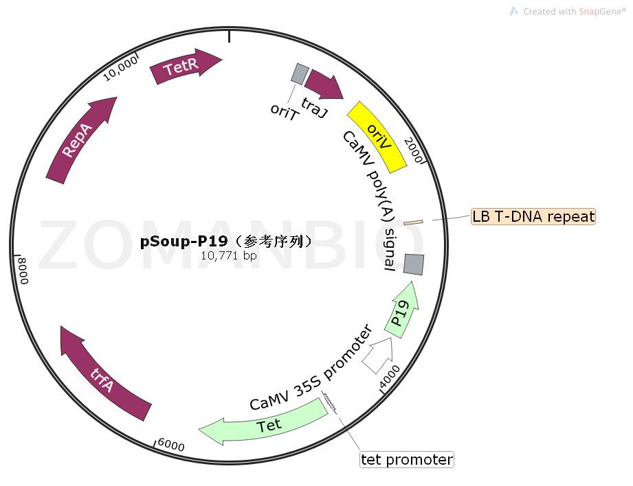 質粒序列可參考(具體以測序為準)下載:ZK2318 pSoup+P19植物輔助質粒.txt