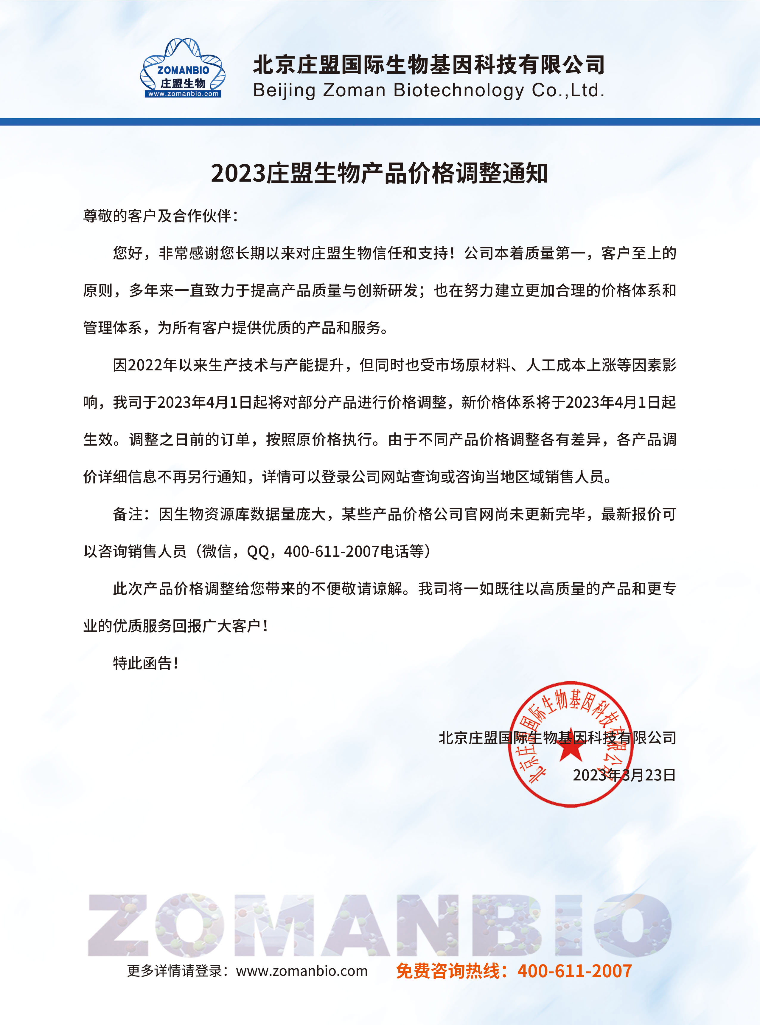 2023年莊盟生物產品價格將做出調整,特此函告,請知悉。