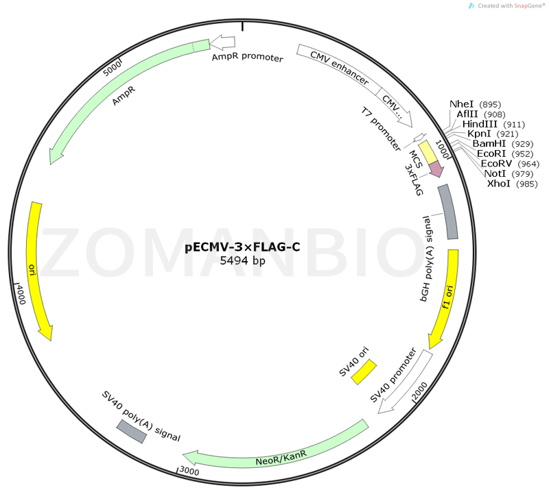 產品名稱:pCMV-T7-MCS-3×FLAG-Neo(別名pCDNA3.1-3×FLAG-C;pECMV-3×FLAG-C)質粒