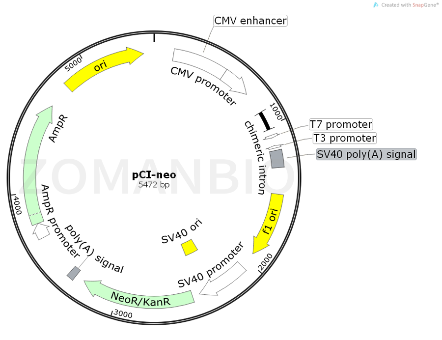 pCI-neo Mammalian Expression Vector(pCI-neo 哺乳動(dòng)物表達(dá)載體) 攜帶有人類(lèi)巨細(xì)胞病毒(CMV) 的即刻早期增強(qiáng)子/ 啟動(dòng)子區(qū)域,來(lái)促進(jìn)哺乳動(dòng)物細(xì)胞中插入克隆DNA 的組成型表達(dá)。此載體也帶有新霉素磷酸轉(zhuǎn)移酶基因, 一種哺乳動(dòng)物細(xì)胞的選擇性標(biāo)志物。通過(guò)G-418 抗性篩選轉(zhuǎn)染細(xì)胞,pCI-neo 載體能夠用于瞬時(shí)或穩(wěn)定表達(dá)。