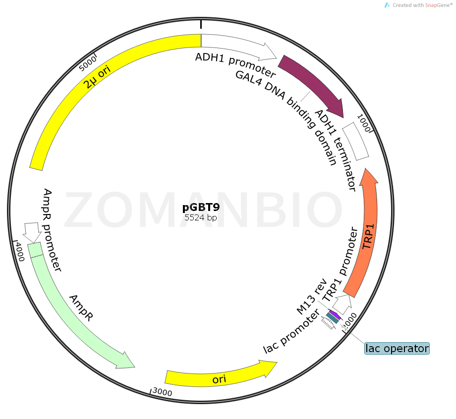 pGBT9 generates a hybrid protein that contains the sequences for the GAL4 DNA-binding domain (DNA-BD; a.a. 1–147). For the construction of a hybrid protein, the gene encoding the protein of interest is ligated into the MCS in the correct orientation and in the correct reading frame such that a fusion protein is generated. The fusion protein is expressed in yeast host cells from the constitutive ADH1 promoter; transcription is terminated at the ADH1 transcription termination signal. The hybrid protein is targeted to the yeast nucleus by nuclear localization sequences that are an intrinsic part of the GAL4 DNA-BD . pGBT9 is a shuttle vector that replicates autonomously in both E. coli and S. cerevisiae. It carries the bla gene (for ampicillin resistance in E. coli) and the TRP1 nutritional marker that allow yeast auxotrophs carrying pGBT9 to grow on limiting synthetic medium lacking Trp.