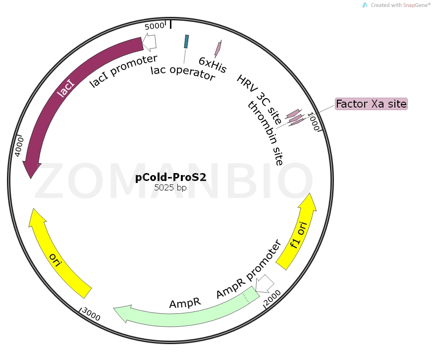 pCold ProS2 DNA 是一種融合的冷休克表達(dá)載體,使用來源于革蘭氏陰性菌Myxococcus xanthus中的Protein S作為可溶性標(biāo)簽。這種Protein S存在于粘細(xì)菌的孢子衣中,由173個(gè)氨基酸殘基組成,是一種非常穩(wěn)定的可溶性蛋白質(zhì)。將兩個(gè)Protein S的N-末端結(jié)構(gòu)域串聯(lián),再結(jié)合ProS2 Tag的作用,就能使融合目的蛋白的穩(wěn)定性和可溶性得到提高。此外,由于目的蛋白和ProS2-Tag的相互作用性很低,因此可以將二者有效分離。pCold ProS2 DNA Vector在cspA啟動(dòng)子的下游插入了5’非編碼區(qū)(5’-UTR)、翻譯增強(qiáng)元件(TEE)、His-Tag序列、ProS2-Tag和多克隆位點(diǎn)(MCS)。在ProS2-Tag和多克隆位點(diǎn)(MCS)之間主要是HRV3C Protease、Thrombin和Factor Xa的切斷位點(diǎn),用來消除融合蛋白質(zhì)的標(biāo)簽。此外,在cspA啟動(dòng)子下游還插入了lac operator,可以嚴(yán)格調(diào)控目的基因的表達(dá)。由于本制品的啟動(dòng)子是大腸桿菌來源的,所以大部分大腸桿菌都可以作為表達(dá)宿主使用??傊琾Cold ProS2 DNAVector提供的冷休克技術(shù),能夠促進(jìn)蛋白質(zhì)的正確折疊,增加目的蛋白質(zhì)的可溶性,對(duì)于一些棘手的目的蛋白質(zhì)的表達(dá)是一個(gè)很好的選擇。