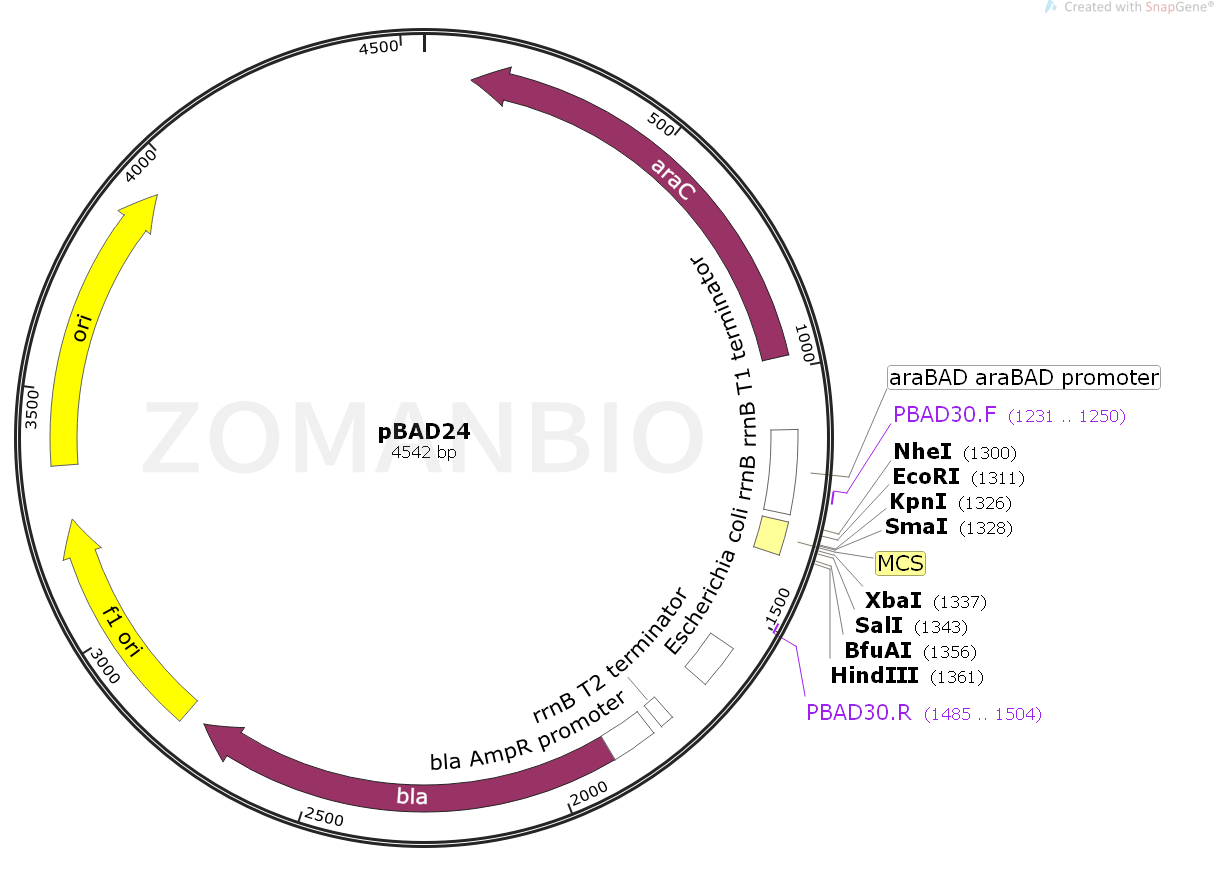pBAD24質粒是衍生于pBR322載體。載體設計用來在大腸桿菌中進行可調節,劑量依賴性的表達和純化重組目的蛋白。使大腸桿菌araBAD啟動子(pBAD)增強了大腸桿菌重組蛋白可溶性表達的水平。pBAD/His和pBAD/Myc-His系列載體上的調節蛋白AraC能夠調控pBad啟動子。