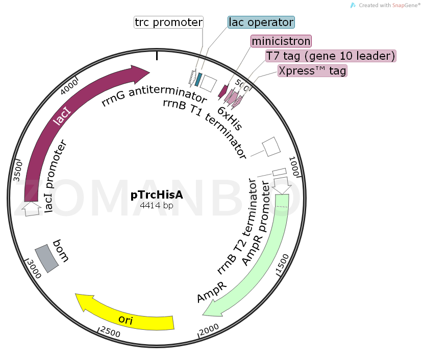 pTrcHis載體是來由pBR322質粒衍生而來的表達載體,設計用來在大腸桿菌中進行重組蛋白的高效表達和純化。載體上的Trc啟動子和rrnB抗終止區使得高水平蛋白表達成為可能.Trc啟動子由Trp啟動子的-35區域和Lac啟動子的-10區域共同組成。pTrcHis載體同時包含有一個LacIq基因,該基因編碼了Lac啟動子的抑制蛋白。LacIq基因的存在使得宿主菌是LacIq+還是LacIq-都可以高效抑制插入基因的轉錄。進行蛋白表達時,大腸桿菌需要生長到對數生長期,然后加入1mM IPTG,去除阻遏蛋白,誘導表達。載體上pTrcHis載體是來由pBR322質粒衍生而來的表達載體,設計用來在大腸桿菌中進行重組蛋白的高效表達和純化。載體上的Trc啟動子和rrnB抗終止區使得高水平蛋白表達成為可能.Trc啟動子由Trp啟動子的-35區域和Lac啟動子的-10區域共同組成。pTrcHis載體同時包含有一個LacIq基因,該基因編碼了Lac啟動子的抑制蛋白。LacIq基因的存在使得宿主菌是LacIq+還是LacIq-都可以高效抑制插入基因的轉錄。進行蛋白表達時,大腸桿菌需要生長到對數生長期,然后加入1mM IPTG,去除阻遏蛋白,誘導表達。載體上的迷你順反子結構能夠增強插入基因的轉錄水平,從而高水平表達目的蛋白。DNA插入片段位于載體表達片段下游,在其上游有一個N-端融合表達多肽序列,該序列包含有ATG起始密碼子,6xHis標簽,T7噬菌體10號基因的翻譯增強子,X press抗原表位,腸激酶酶切識別位點的迷你順反子結構,能夠增強插入基因的轉錄水平,從而高水平表達目的蛋白。DNA插入片段位于載體表達片段下游,在其上游有一個N-端融合表達多肽序列,該序列包含有ATG起始密碼子,6xHis標簽,T7噬菌體10號基因的翻譯增強子,X press抗原表位,腸激酶酶切識別位點。