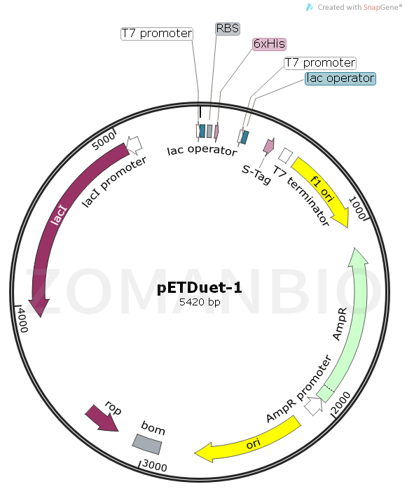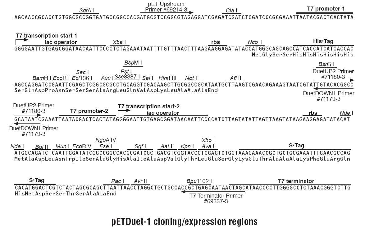 pETDuet-1載體被設計用來在大腸桿菌中同時表達兩個外源基因. 載體含有兩個多克隆位點,每一個多克隆位點是通過T7啟動子/Lac操縱子和一個核糖體結合位點組成。pETDuet-1攜帶有pBR322質粒來源的ColE1復制子, lacI基因和氨芐抗性基因。本載體可以與pACYCDuet-1載體聯合使用,在合適的宿主菌中,可以一起共表達至多4個目的基因。插入在pETDuet-1載體多克隆位點1的目的基因可以使用pET Upstream 引物和DuetDOWN1 引物進行測序,插入在多克隆位點2的目的基因可以通過DuetUP2 引物 和T7 Terminator 引物進行目的基因測序。