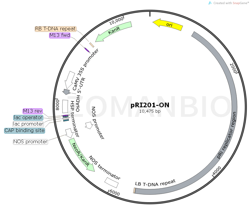 pRI201-ON是一個單子葉植物發根農桿菌的雙表達質粒。The Ri Plasmid pRI201 is designed for the transformation and expression of target genes from plant cells. This series of binary vectors for plant transformation retains the backbone of the pRI101 vectors, including an alcohol dehydrogenase (ADH) gene-derived 5' untranslated region (5'-UTR) downstream of the cauliflower mosaic virus (CaMV promoter)-derived 35S promoter. Additionally, these vectors have a heat shock protein (HSP) gene-derived terminator in place of the nopaline synthase (NOS) gene-derived terminator, allowing higher target gene expression compared with the pRI101 vector series. Multigene transformation with a single vector can be achieved by integrating an expression cassette containing another gene (promoter + enhancer + gene of interest + terminator) into the vector's second multiple cloning site (MCS2) located downstream of the HSP terminator.