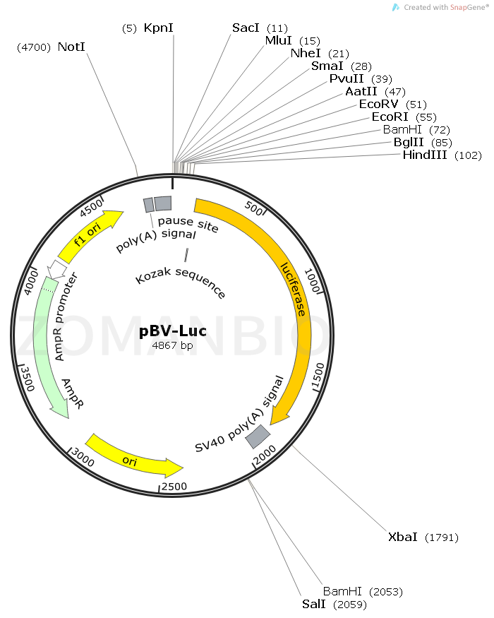 質粒序列請下載:ZK2075 pBV-Luc哺乳報告質粒.txt